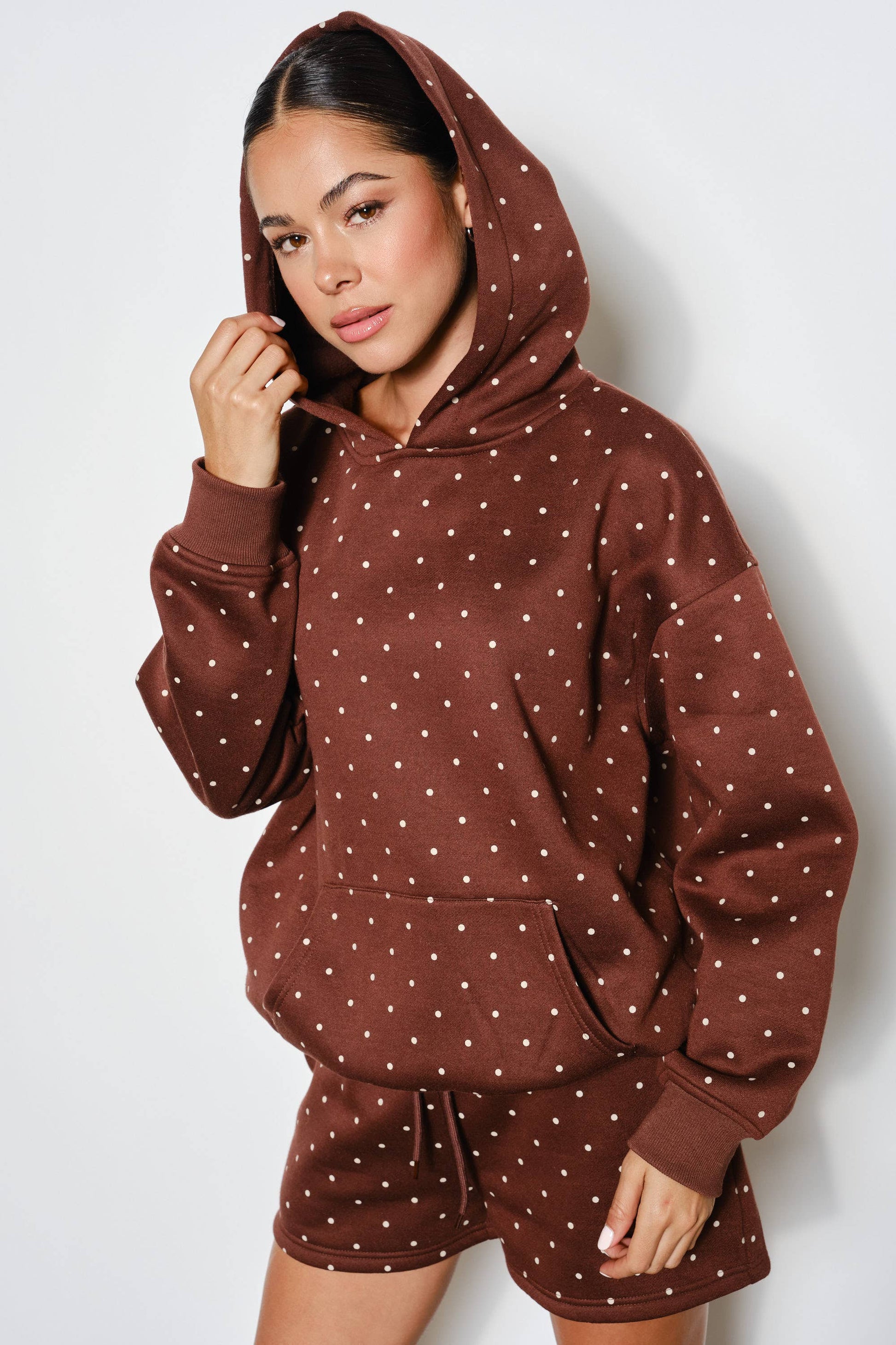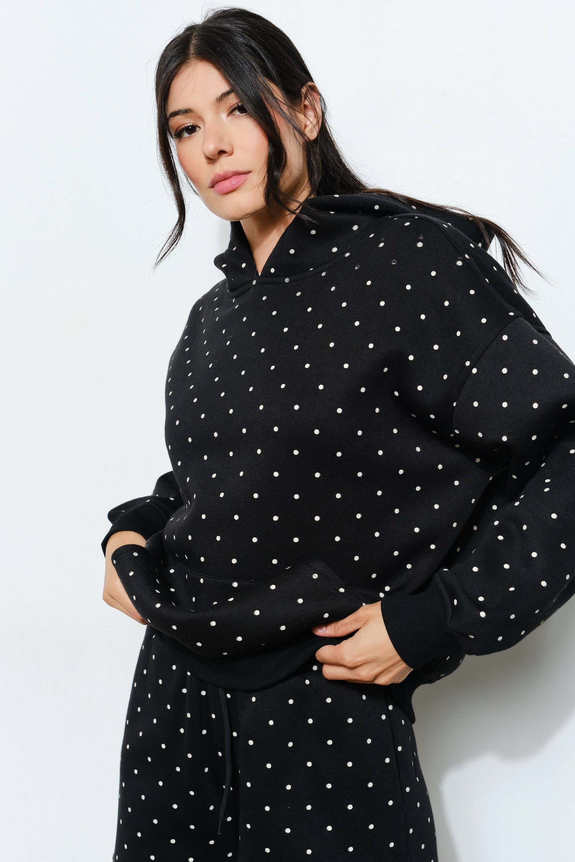 Keywords: polkadot hoodie, oversized sweatshirt, hoodie with pockets, trendy women’s loungewear, matching set top, flirty casual hoodie, youthful comfy sweatshirt