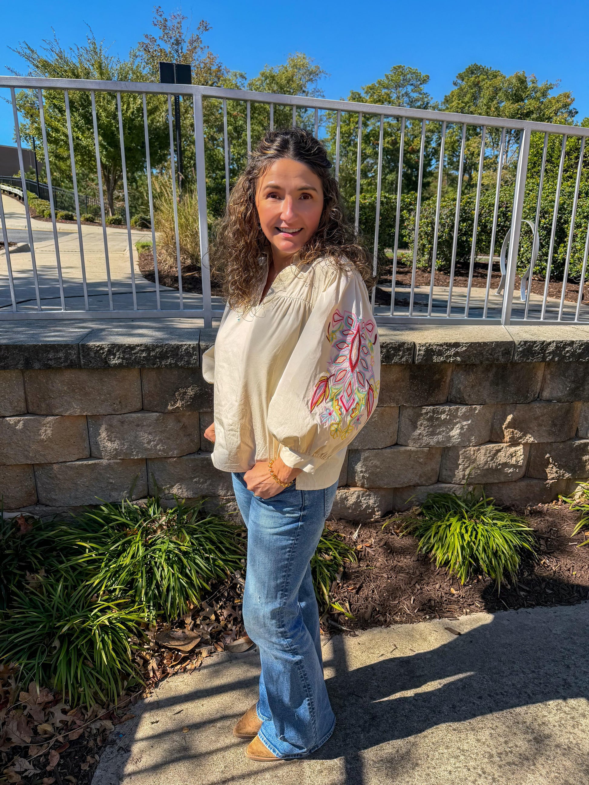Add a touch of effortless charm to your wardrobe with The Mariposa Embroidered Blouse. This cream-toned top features beautifully detailed embroidery along the sleeves in vibrant shades of pink, coral, and gold — giving it the perfect pop of color. The relaxed fit, gathered neckline, and billowy sleeves make it both flattering and comfortable for any occasion. Pair it with jeans and boots for a chic daytime look or dress it up with trousers for a casual evening out.