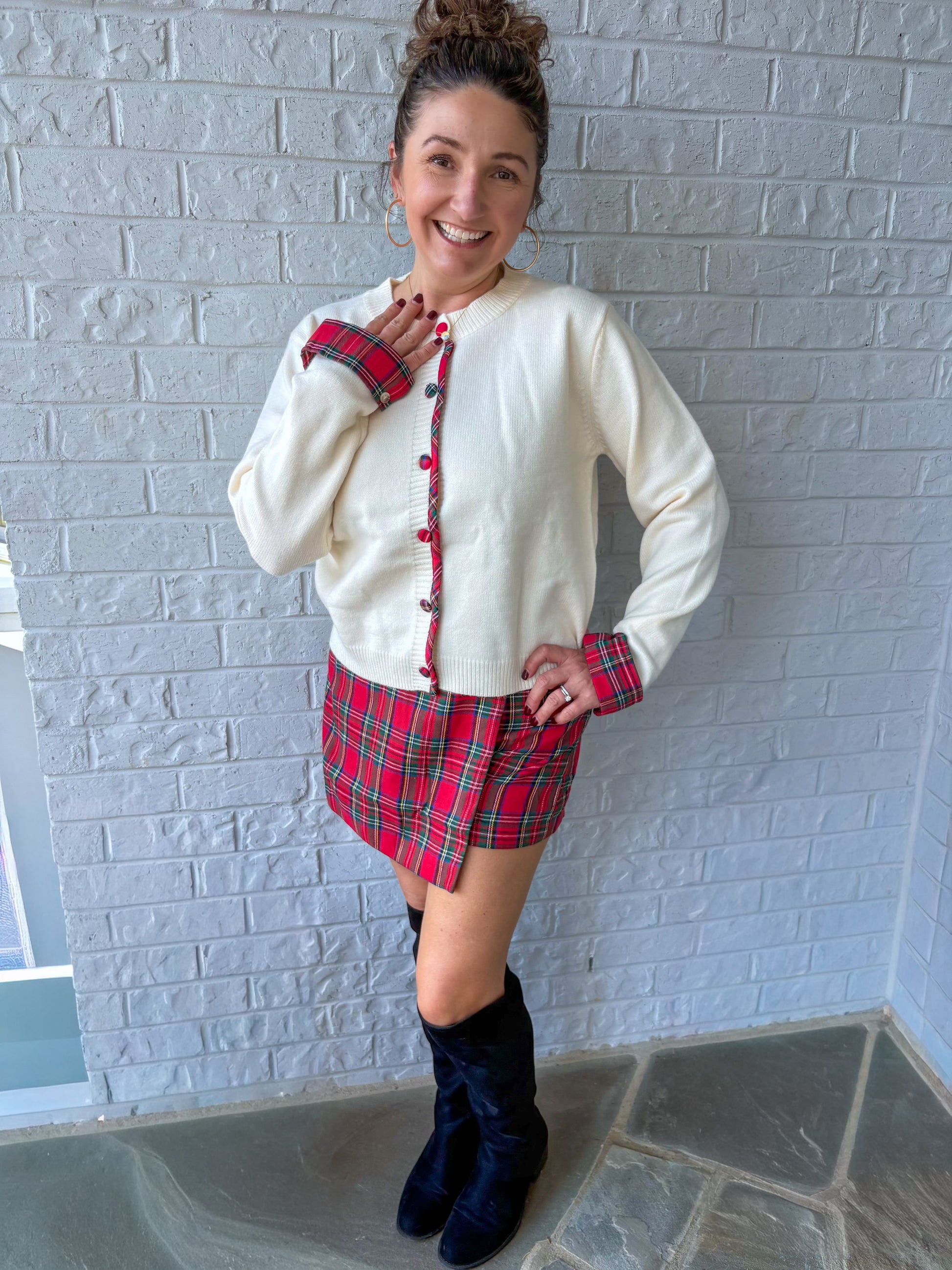 Bring a little cheer to your winter wardrobe with the Holly jolly sweater! This cozy cream cardigan features festive red plaid detailing along the buttons and cuffs for the perfect pop of holiday charm. The soft knit fabric keeps you warm while the playful pattern adds a merry touch to any outfit. Style it with jeans, leggings, or your favorite plaid skirt for an effortlessly festive look all season long.