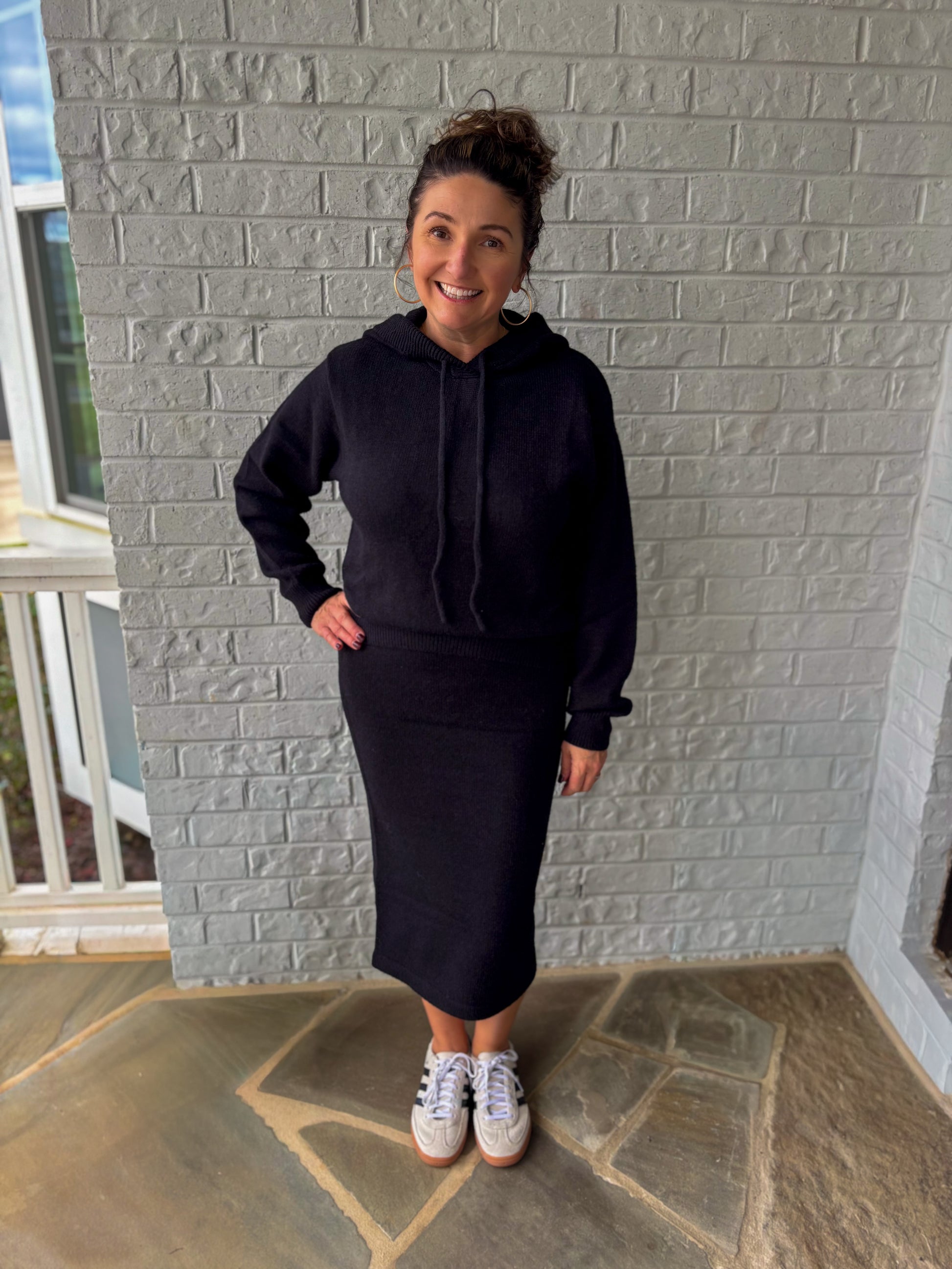 Meet your new go-to for elevated comfort. Our Onyx Luxe Knit Set features a cozy, relaxed-fit hoodie paired with a figure-flattering midi skirt — the perfect blend of laid-back and polished. Crafted from a soft, stretchy knit, this set moves with you while keeping you effortlessly put-together.