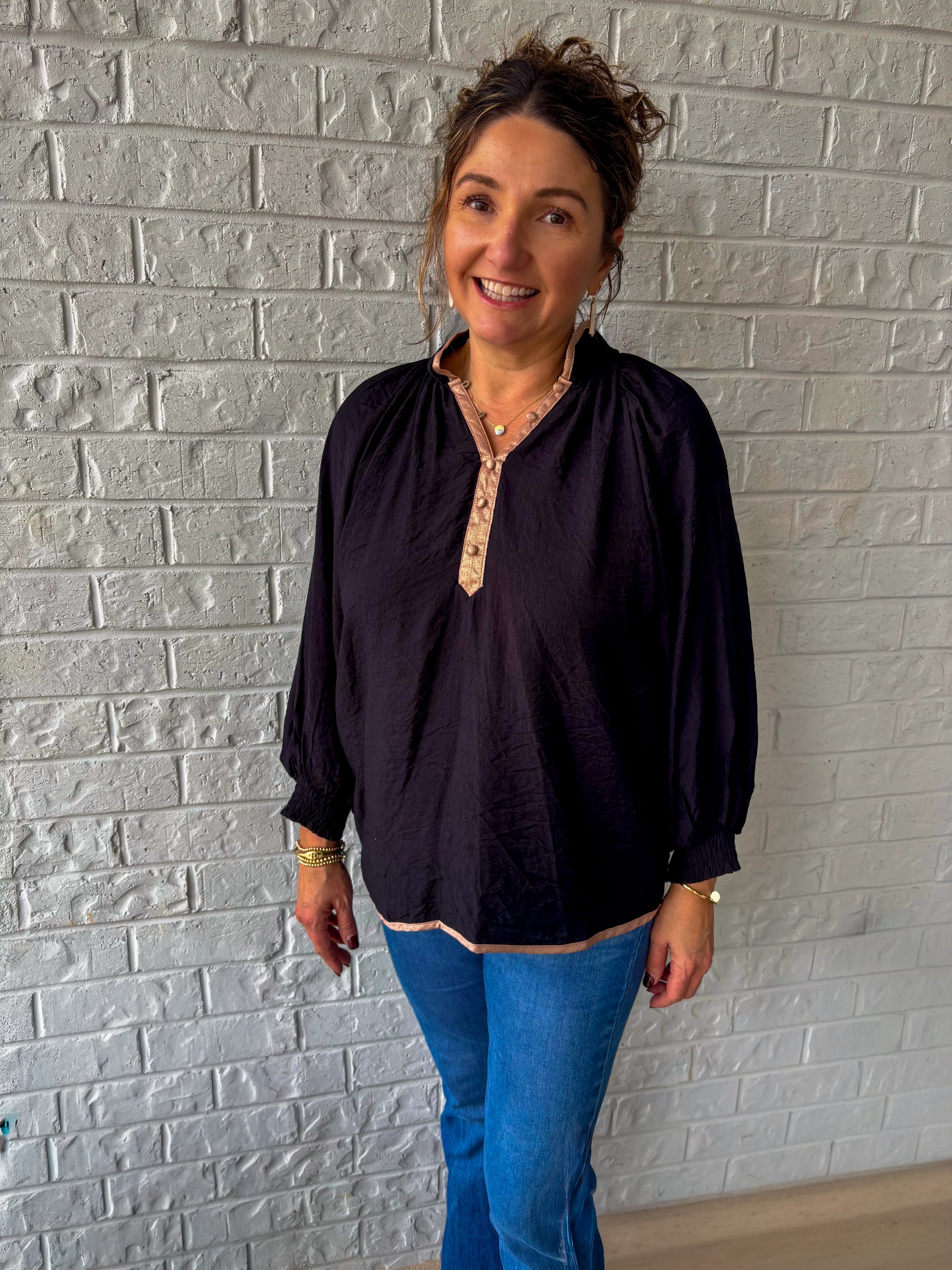 Effortlessly chic and perfectly versatile, the Emerson Blouse is your new go-to for relaxed sophistication. Crafted from a lightweight, flowy fabric, this blouse features a rich black hue contrasted with delicate blush nude trim along the neckline, button placket, and hem. The gathered sleeves with elastic cuffs add a touch of volume and femininity, while the subtle high-low hemline offers a flattering silhouette.