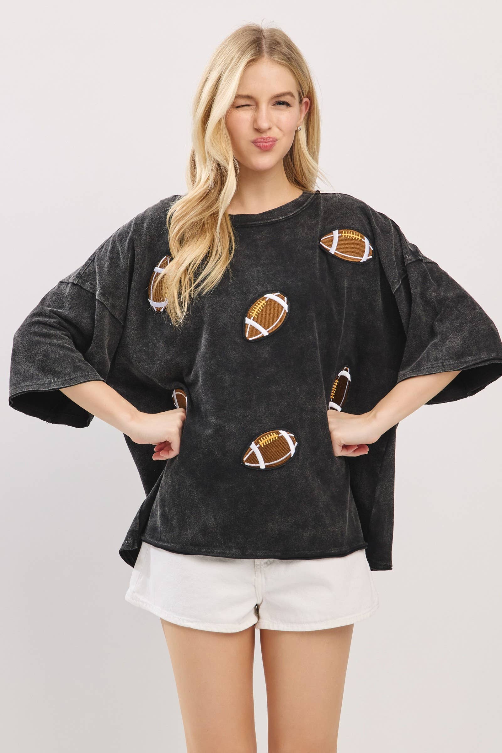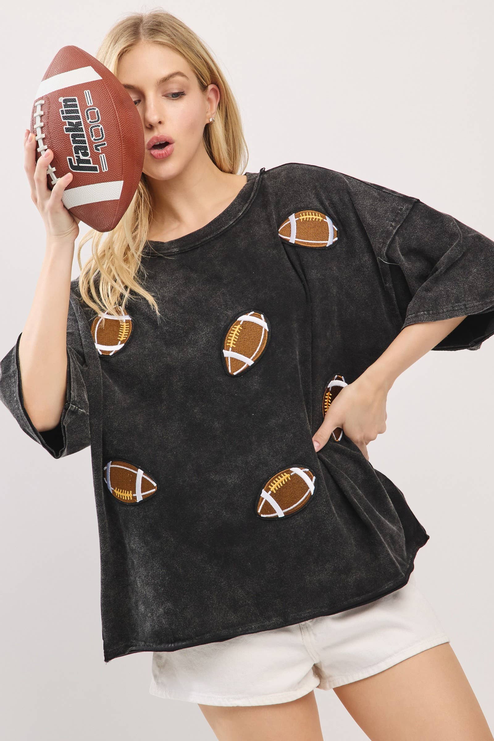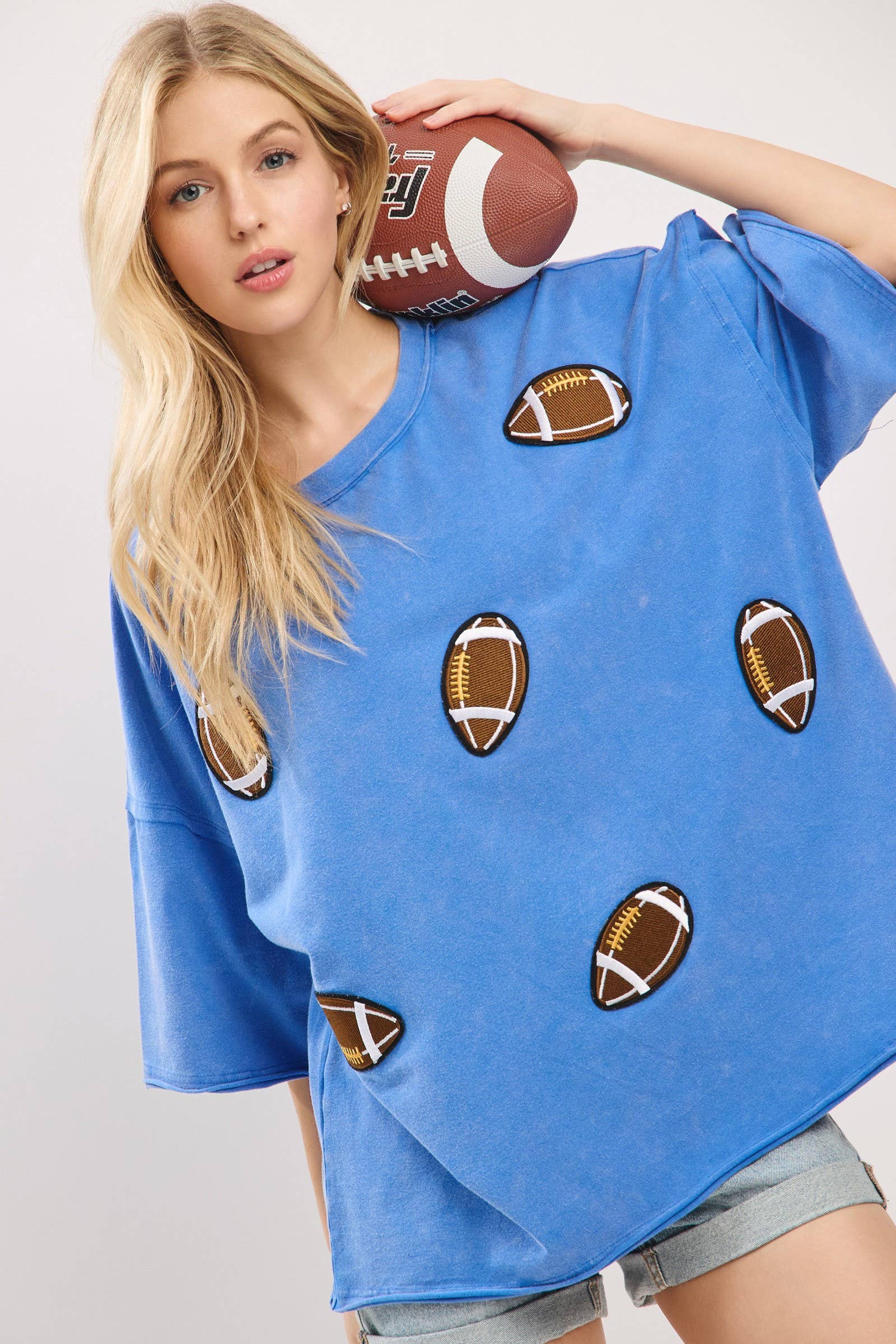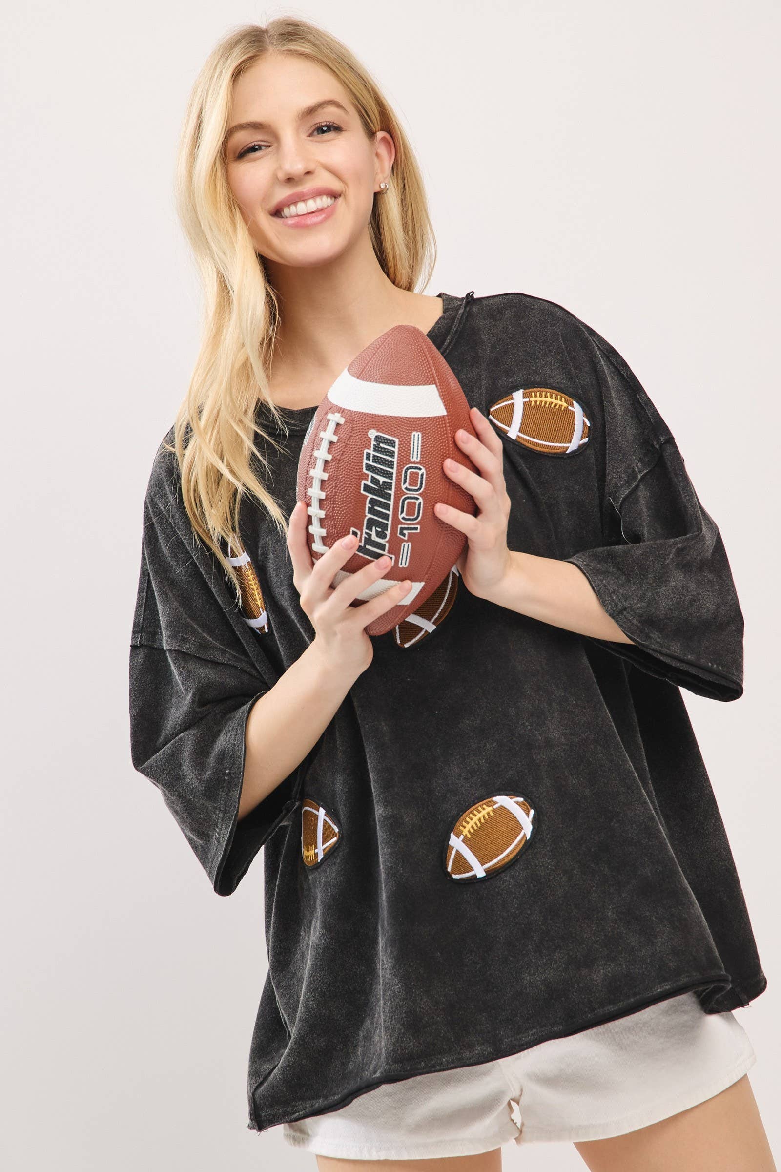 Kick off your gameday look with this oversized vintage-washed tee, featuring bold embroidered football patches that add playful spirit and sporty charm. Designed with a relaxed, boxy silhouette and drop shoulders for ultimate comfort, this tee brings both softness and style. Perfect for tailgates, cheering on your team, or everyday casual wear, it comes in multiple colorways to match your team or mood.