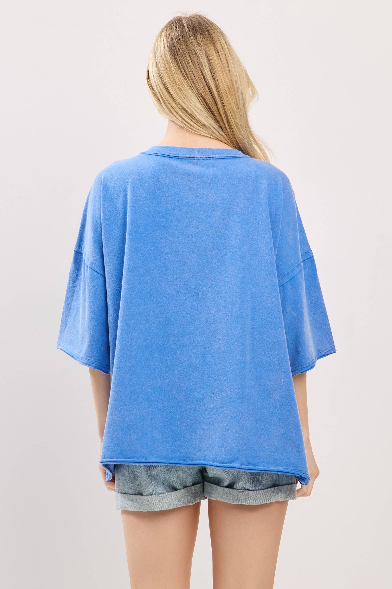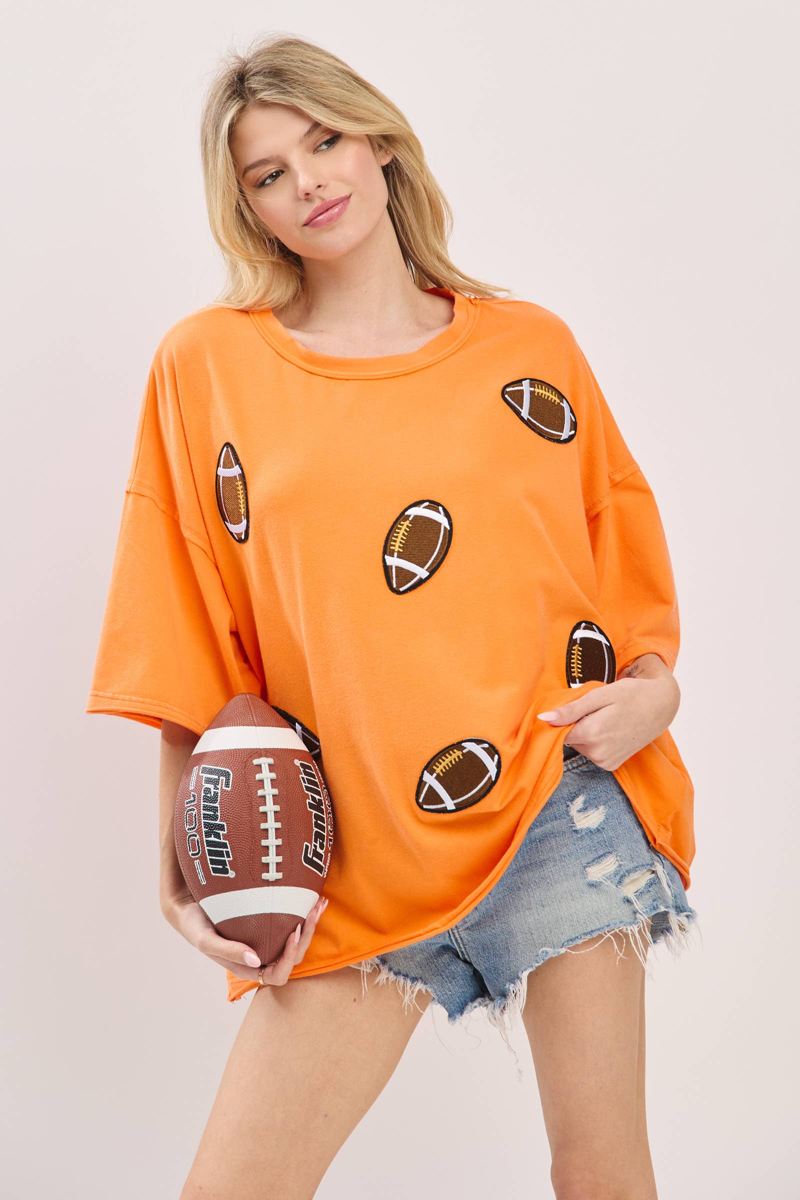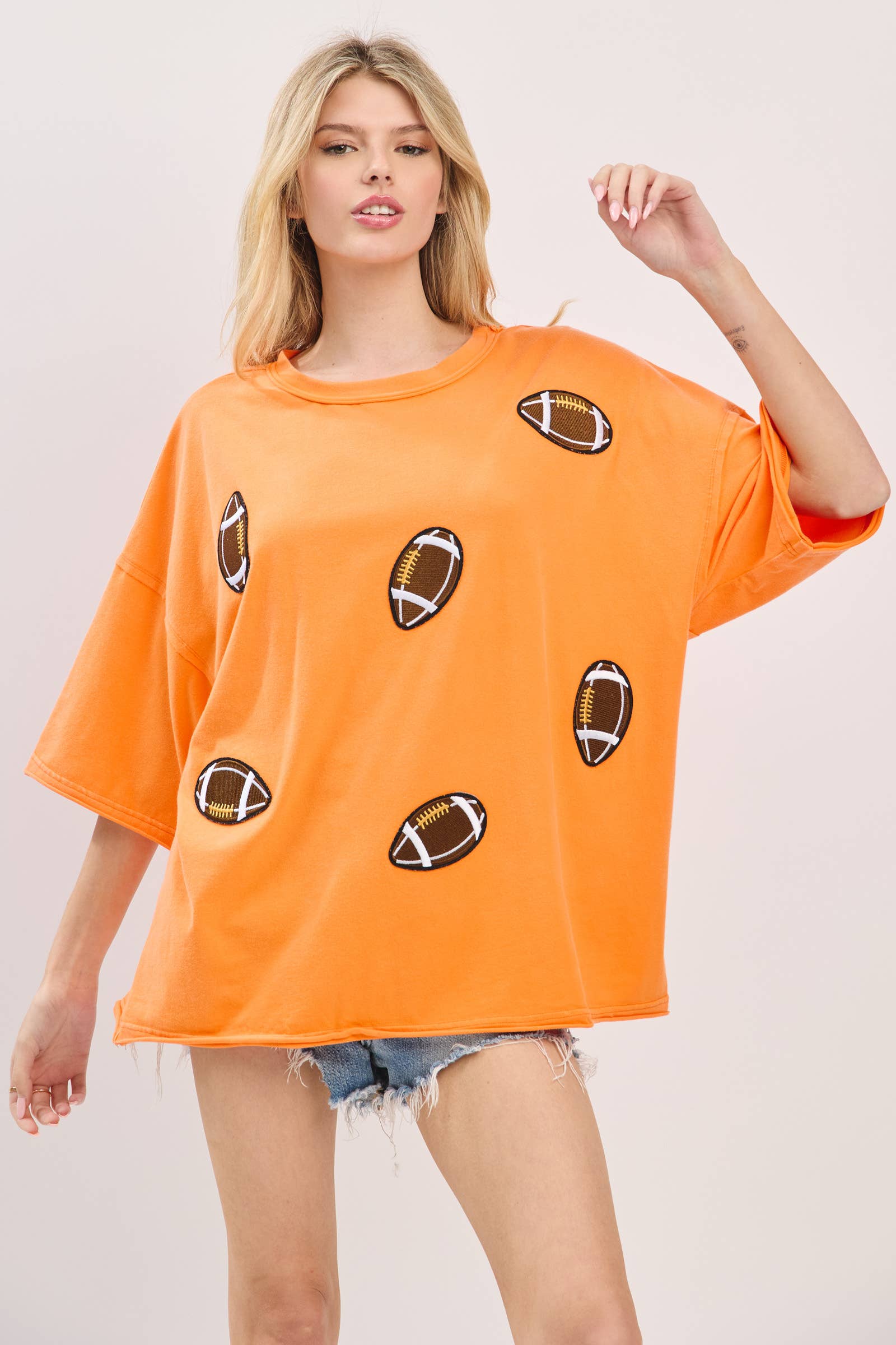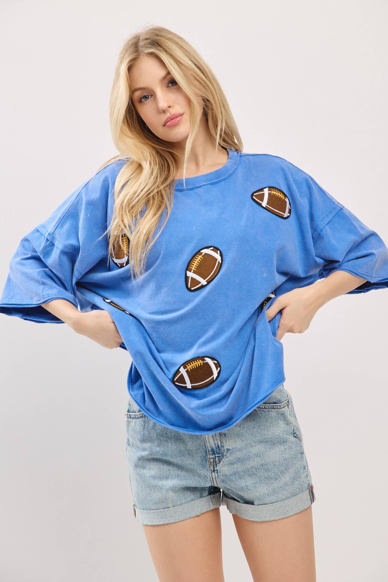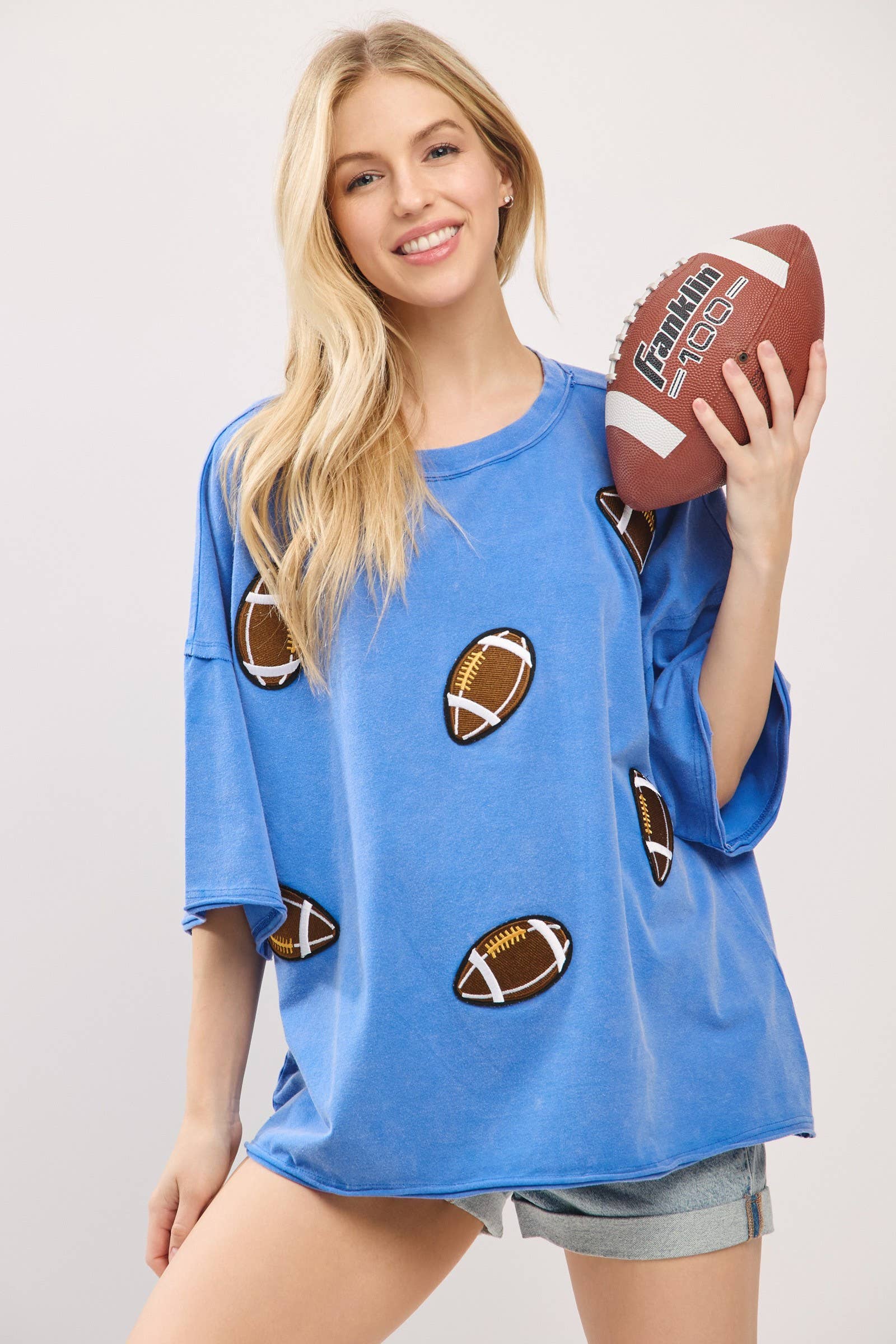 Kick off your gameday look with this oversized vintage-washed tee, featuring bold embroidered football patches that add playful spirit and sporty charm. Designed with a relaxed, boxy silhouette and drop shoulders for ultimate comfort, this tee brings both softness and style. Perfect for tailgates, cheering on your team, or everyday casual wear, it comes in multiple colorways to match your team or mood.
